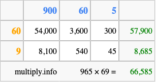 Below is an illustration showing you how to calculate 965 times 69 using the box method, using the instructions above.