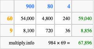 Finally, we add up all the sums we found in step 3 to get our final answer to 984 times 69.