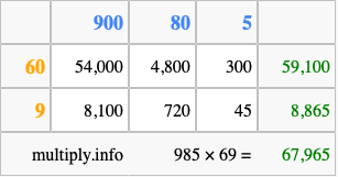 Below is an illustration showing you how to calculate 985 times 69 using the box method, using the instructions above.
