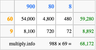 That's all there is to it! As you can see from the box above, the answer to 988 times 69 using the box method is 68,172.