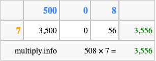 That's all there is to it! As you can see from the box above, the answer to 508 times 7 using the box method is 3,556.