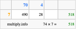 That's all there is to it! As you can see from the box above, the answer to 74 times 7 using the box method is 518.
