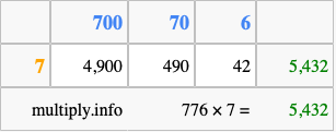 Below is an illustration showing you how to calculate 776 times 7 using the box method, using the instructions above.