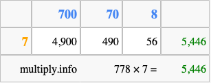 That's all there is to it! As you can see from the box above, the answer to 778 times 7 using the box method is 5,446.