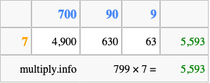 Below is an illustration showing you how to calculate 799 times 7 using the box method, using the instructions above.