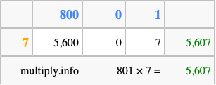 That's all there is to it! As you can see from the box above, the answer to 801 times 7 using the box method is 5,607.