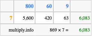 Below is an illustration showing you how to calculate 869 times 7 using the box method, using the instructions above.