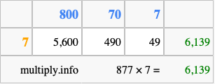 That's all there is to it! As you can see from the box above, the answer to 877 times 7 using the box method is 6,139.