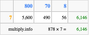 That's all there is to it! As you can see from the box above, the answer to 878 times 7 using the box method is 6,146.