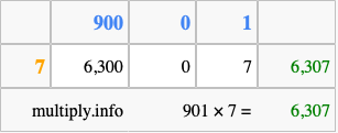 Below is an illustration showing you how to calculate 901 times 7 using the box method, using the instructions above.