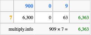 Below is an illustration showing you how to calculate 909 times 7 using the box method, using the instructions above.