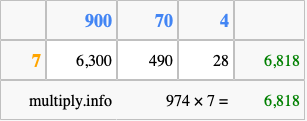That's all there is to it! As you can see from the box above, the answer to 974 times 7 using the box method is 6,818.