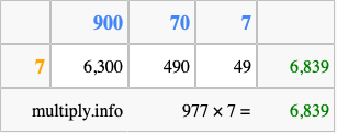 That's all there is to it! As you can see from the box above, the answer to 977 times 7 using the box method is 6,839.