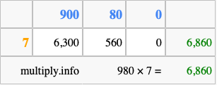 That's all there is to it! As you can see from the box above, the answer to 980 times 7 using the box method is 6,860.
