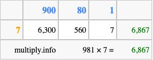 That's all there is to it! As you can see from the box above, the answer to 981 times 7 using the box method is 6,867.