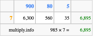 Below is an illustration showing you how to calculate 985 times 7 using the box method, using the instructions above.