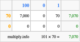 Below is an illustration showing you how to calculate 101 times 70 using the box method, using the instructions above.