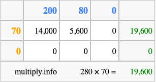 That's all there is to it! As you can see from the box above, the answer to 280 times 70 using the box method is 19,600.