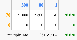 That's all there is to it! As you can see from the box above, the answer to 381 times 70 using the box method is 26,670.