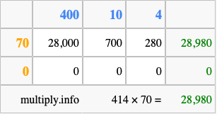 That's all there is to it! As you can see from the box above, the answer to 414 times 70 using the box method is 28,980.