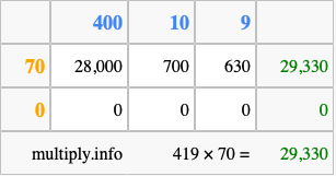 Below is an illustration showing you how to calculate 419 times 70 using the box method, using the instructions above.