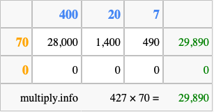 That's all there is to it! As you can see from the box above, the answer to 427 times 70 using the box method is 29,890.