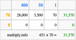 That's all there is to it! As you can see from the box above, the answer to 451 times 70 using the box method is 31,570.