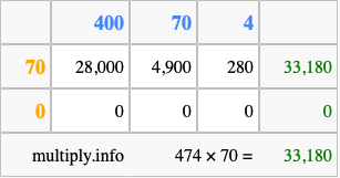 That's all there is to it! As you can see from the box above, the answer to 474 times 70 using the box method is 33,180.
