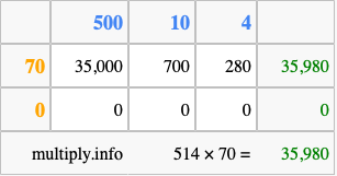 That's all there is to it! As you can see from the box above, the answer to 514 times 70 using the box method is 35,980.
