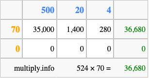 That's all there is to it! As you can see from the box above, the answer to 524 times 70 using the box method is 36,680.