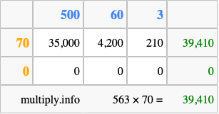 That's all there is to it! As you can see from the box above, the answer to 563 times 70 using the box method is 39,410.