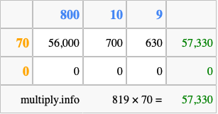 That's all there is to it! As you can see from the box above, the answer to 819 times 70 using the box method is 57,330.