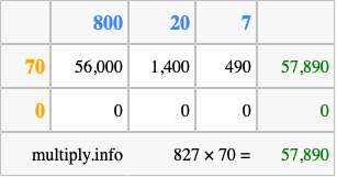That's all there is to it! As you can see from the box above, the answer to 827 times 70 using the box method is 57,890.