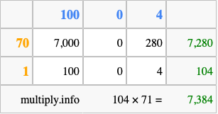 That's all there is to it! As you can see from the box above, the answer to 104 times 71 using the box method is 7,384.