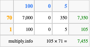 Finally, we add up all the sums we found in step 3 to get our final answer to 105 times 71.