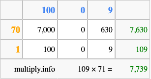 That's all there is to it! As you can see from the box above, the answer to 109 times 71 using the box method is 7,739.