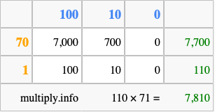 Finally, we add up all the sums we found in step 3 to get our final answer to 110 times 71.