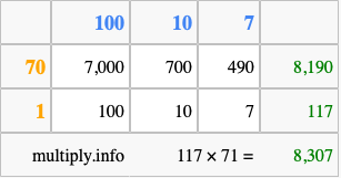 That's all there is to it! As you can see from the box above, the answer to 117 times 71 using the box method is 8,307.