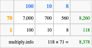 That's all there is to it! As you can see from the box above, the answer to 118 times 71 using the box method is 8,378.