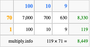 That's all there is to it! As you can see from the box above, the answer to 119 times 71 using the box method is 8,449.