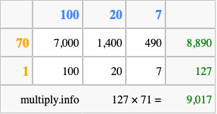 Below is an illustration showing you how to calculate 127 times 71 using the box method, using the instructions above.