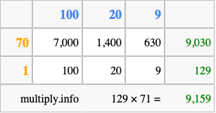 Finally, we add up all the sums we found in step 3 to get our final answer to 129 times 71.