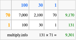 Below is an illustration showing you how to calculate 131 times 71 using the box method, using the instructions above.