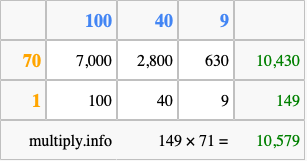 Below is an illustration showing you how to calculate 149 times 71 using the box method, using the instructions above.