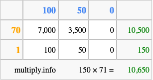 Below is an illustration showing you how to calculate 150 times 71 using the box method, using the instructions above.