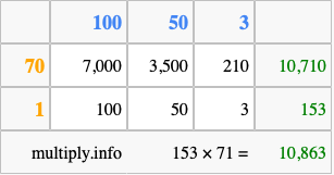 That's all there is to it! As you can see from the box above, the answer to 153 times 71 using the box method is 10,863.