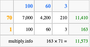 That's all there is to it! As you can see from the box above, the answer to 163 times 71 using the box method is 11,573.