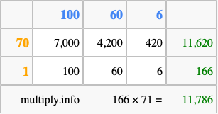 That's all there is to it! As you can see from the box above, the answer to 166 times 71 using the box method is 11,786.