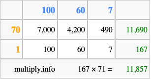 Below is an illustration showing you how to calculate 167 times 71 using the box method, using the instructions above.