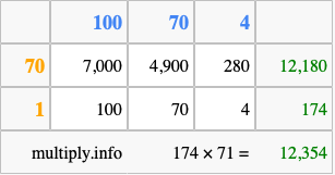 Finally, we add up all the sums we found in step 3 to get our final answer to 174 times 71.